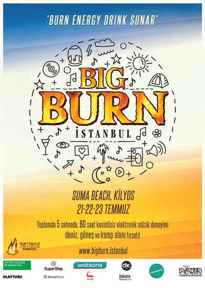 Burn Enerji İçeceği şimdi de Türkiye’ye yepyeni bir elektronik müzik festivali deneyimi yaşatmak için ‘Big Burn İstanbul’’u düzenliyor. 21-22-23 Temmuz tarihlerinde Suma Beach’te gerçekleşecek olan festivalde, katılımcılar 3 gün boyunca toplam 5 sahnede 60 saatten fazla kesintisiz müzik ve kamp deneyimi yaşayacaklar!