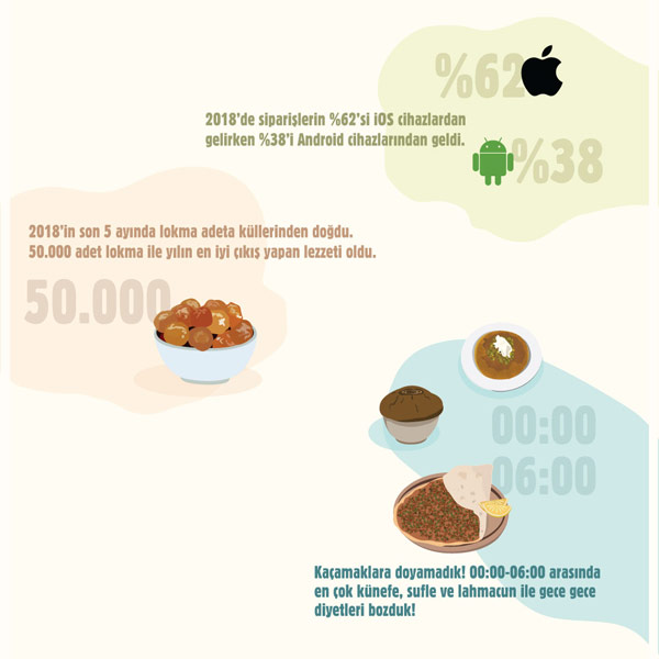İstanbulluların en çok tercih ettiği lezzetlerin başında künefe ve tatlı yer aldı. En çok tercih edilen yemeklerde ise hamburger ilk sırayı alırken, hamburgeri lahmacun ve Adana dürüm takip etti. 2018’in son 5 ayında ise geleneksel lezzetlerimizden lokma tekrar sahneye çıktı. Scotty Yemek’in teslim ettiği 50 bin adet lokma ile, yılın en iyi çıkış yapan lezzeti oldu. Verilere göre yılın ikinci yarısında tam 60 bin fincan kahve içildi. Latte favori iken, filtre kahve ve Americano da ilk üçte yerini aldı. İstanbullular pazartesi sendromuyla baş etmek için ise en fazla kahve siparişi verdi. Gece acıkanlar ya da tatlı bir kaçamak yapmak isteyenler ise en fazla künefe, sufle, lahmacun ve kebap istedi. Scotty Yemek’ten verilen siparişlerin yüzde 62’si IOS’tan, yüzde 38’i ise android kullanıcılarından geldi.