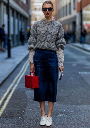 Kaleme etek, kazak içine dantel bluz, sneaker ve küçük bir çanta.